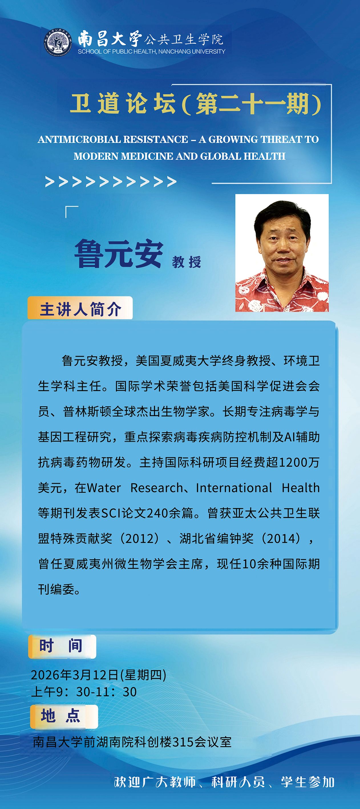 鲁元安教授,美国夏威夷大学终身教授、环境卫生学科主任。国际学术荣誉包括美国科学促进会会员、普林斯顿全球杰出生物学家。长期专注病毒学与基因工程研究,重点探索病毒疾病防控机制及AI辅助抗病毒药物研发。主持国际科研项目经费超1200万美元,在Water Research、International Health等期刊发表SCI论文240余篇。曾获亚太公共卫生联盟特殊贡献奖(2012)、湖北省编钟奖(2014),曾任夏威夷州微生物学会主席,现任10余种国际期刊编委。