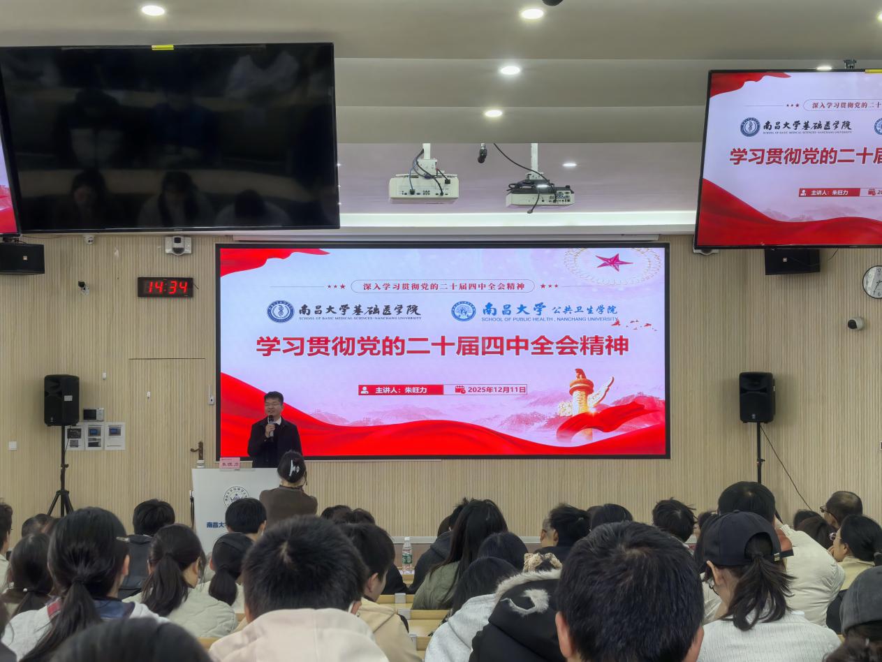 12月11日下午,基础医学院、公共卫生学院联合开展学习贯彻党的二十届四中全会精神宣讲报告会,南昌大学宣讲团成员、政策研究与综合改革办公室主任朱旺力作宣讲报告。基础医学院、公共卫生学院师生共计250余人参加。