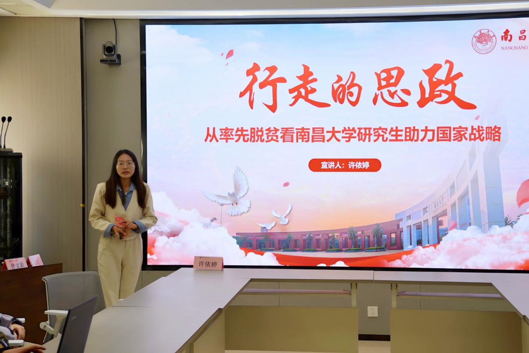 第二位宣讲人许依婷同学围绕“行走的思政:从率先脱贫看南昌大学研究生助力国家战略”进行分享。她以脱贫攻坚这一国家重大战略为背景,聚焦南昌大学研究生群体在助力脱贫攻坚中的具体行动与实践成果。通过鲜活的案例讲述,展现了南大学子将个人理想融入国家发展大局的责任担当,诠释了“行走的思政”如何让理论学习与实践行动深度融合,为在场师生呈现了青年一代在国家战略实施中的青春力量。