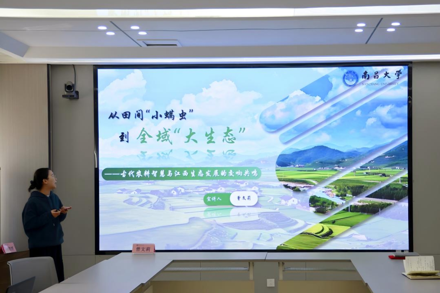 第一位宣讲人曾文莉同学以“从田间‘小螨虫’到全域‘大生态’——古代农耕智慧与江西生态发展的交响共鸣”为题展开。她从古代农耕实践中的生态智慧切入,通过剖析田间“小螨虫”的治理逻辑,延伸至全域生态保护的系统思维,生动阐释了传统农耕文明与现代生态发展理念的内在契合。宣讲中,曾文莉结合江西本地生态保护实践案例,展现了党领导生态文明建设的重大战略部署在地方的生动实践,让师生深刻认识到生态保护与发展的辩证关系。