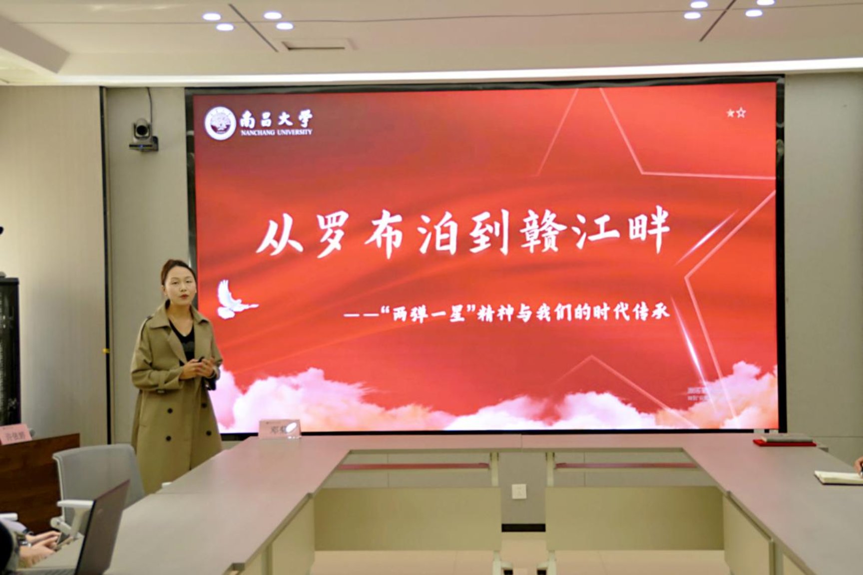 第三位宣讲人邓菊同学以“从罗布泊到赣江畔——‘两弹一星’精神与我们的时代传承”为题开展宣讲。她回溯了“两弹一星”研制历程中的艰辛岁月与光辉成就,深入解读了“热爱祖国、无私奉献,自力更生、艰苦奋斗,大力协同、勇于登攀”的“两弹一星”精神内核。同时,邓菊将这种精神与赣江畔的时代发展相结合,探讨了新时代青年如何传承和践行“两弹一星”精神,在各自领域勇挑重担、奋勇争先,为国家建设贡献力量。