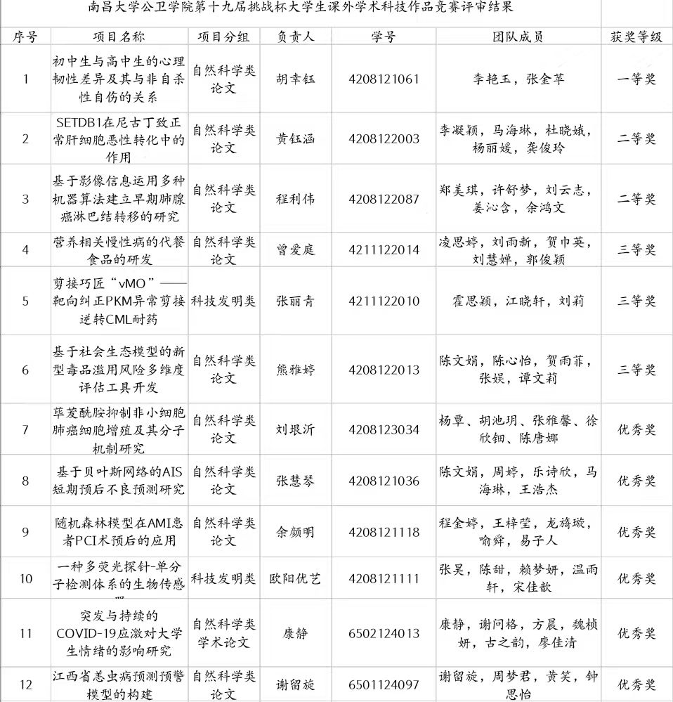 经过激烈的角逐与公正的评审,最终12支队伍脱颖而出。本次“挑战杯”院赛答辩的成功举办激发了学子创新热情,明晰学术与实践融合路径。为学院营造了浓厚的学术氛围,未来,学院将继续以“挑战杯”与创新人才培养内容紧密结合,加强学生创新能力的培养,提升教学水平和人才培养质量,培养出适应新形势要求的高素质公卫人才。