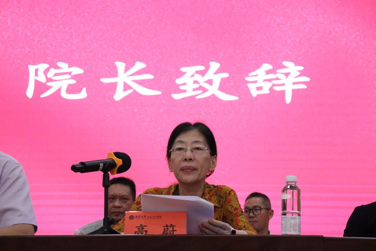 活动在共同观看学院宣传片环节中拉开帷幕,新生与家长初步感受学院的发展历程、学科特色与育人成果。在开场致辞中院长高蔚教授代表学院对2025级新生及家长的到来表示热烈欢迎,并简要介绍了学院的办学理念、师资力量与人才培养目标。她指出,大学的真谛在于 “认识自我,追寻意义”,她勉励新同学们要努力做到 “有所学、有所成、有所爱”,在此基础上实现 “立于心、立于意、立于行”,为新生指明成长路径 。