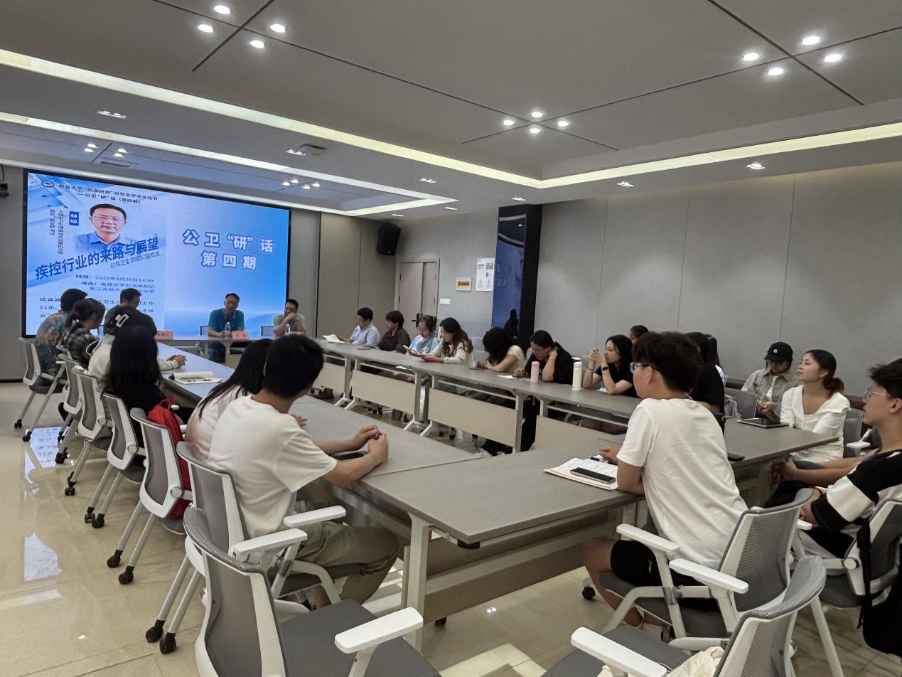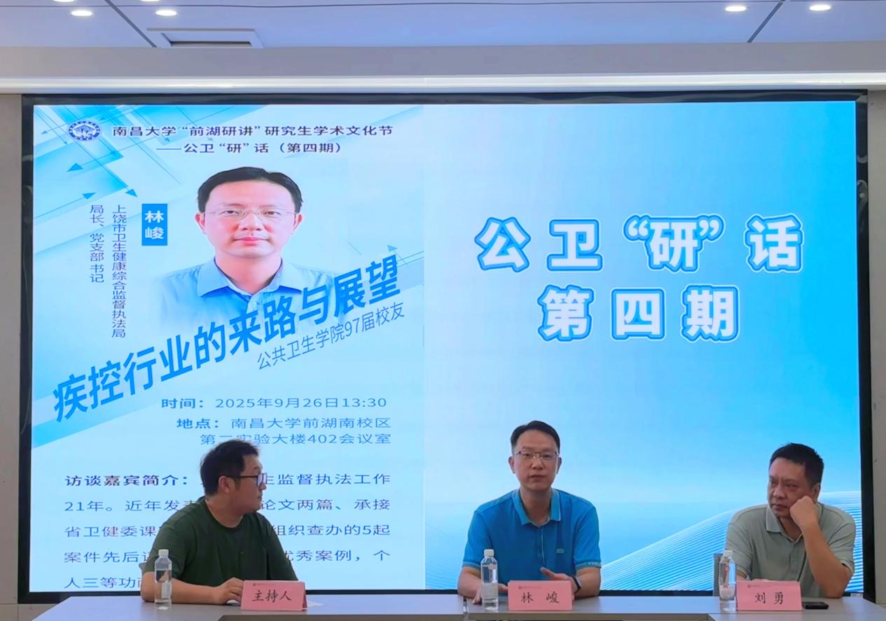 为凝聚校友力量、树立青年榜样,9月26日,南昌大学公共卫生学院特邀上饶市卫生健康综合监督执法局局长、党支部书记,97届优秀校友林峻在前湖校区(南院)402会议室作题为“疾控行业的来路与展望”的专题交流,学院党委委员刘勇、研究生辅导员李少阳及30余名研究生参加。本次访谈会由德育助理张永平主持。