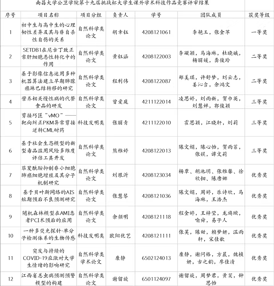 经过激烈的角逐与公正的评审,最终12支队伍脱颖而出。本次“挑战杯”院赛答辩的成功举办激发了学子创新热情,明晰学术与实践融合路径。为学院营造了浓厚的学术氛围,未来,学院将继续以“挑战杯”与创新人才培养内容紧密结合,加强学生创新能力的培养,提升教学水平和人才培养质量,培养出适应新形势要求的高素质公卫人才。