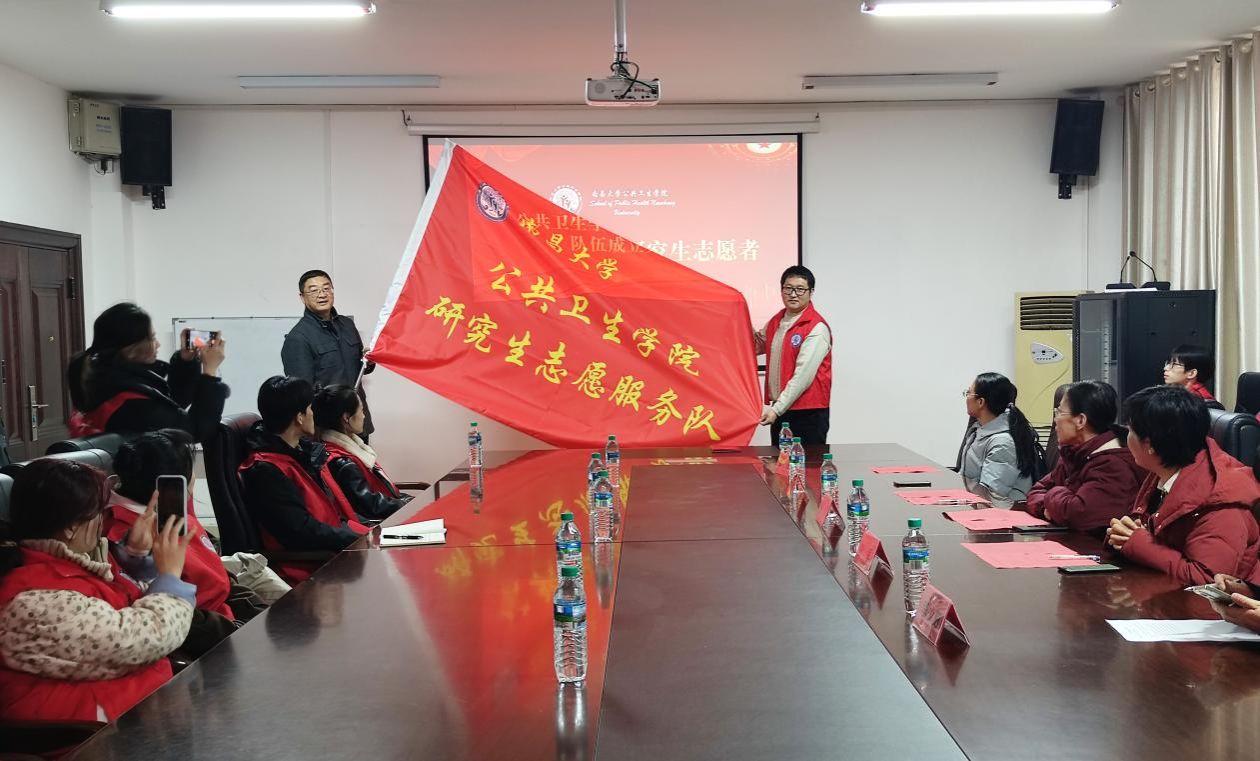 大会伊始,赖志强向全体参会成员报告了公共卫生学院研究生志愿服务队筹备情况,公布了首批志愿者名单并代表学院为志愿服务队授旗。张永平作为志愿者代表接旗并作表态发言,他感谢学院为研究生参与社会服务创造机会,接下来全体研究生志愿者将发挥公共卫生专业特色,彰显青年担当,以真情服务社会,以实践促进成长。