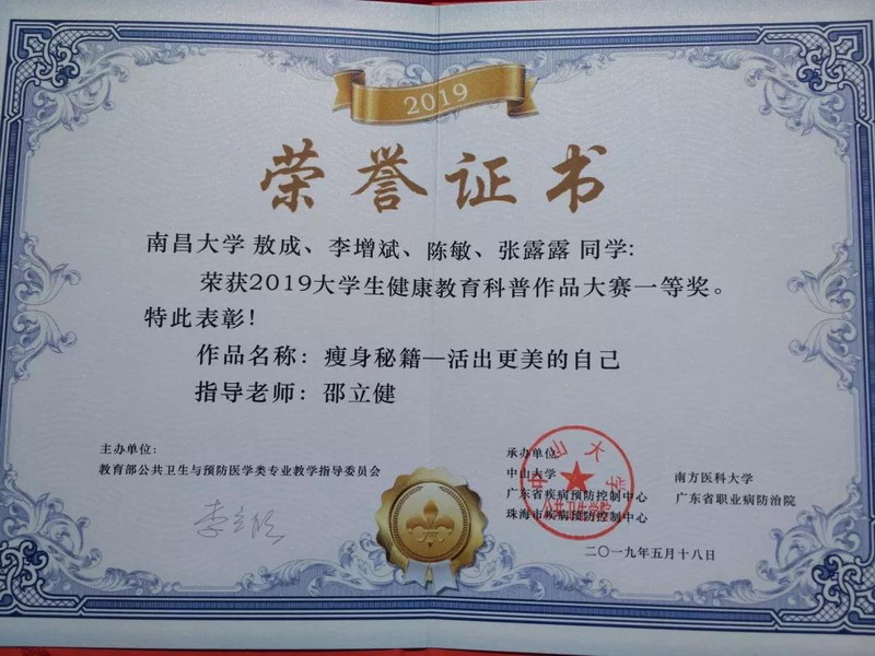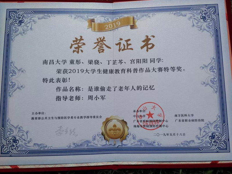 大赛同时还对此前揭晓的全国大学生健康教育科普作品大赛奖项进行了现场颁奖。我院参赛作品《是谁偷走了老年人的记忆》、《瘦身秘籍——活出更美的自己》分别荣获特等奖和一等奖。