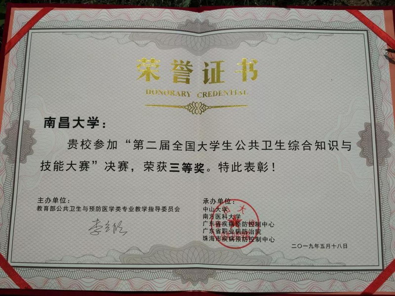 5月18日下午,由教育部公共卫生与预防医学类专业教学指导委员会主办,中山大学公共卫生学院、南方医科大学公共卫生学院、广东省疾病预防控制中心、广东省职业病防治院和珠海市疾病预防控制中心承办,中国生物技术股份有限公司协办的第二届全国大学生公共卫生综合知识与技能大赛在珠海完美落幕。我院来自2015级预防医学专业曾子强等6名同学组成的参赛队伍,在由学院领导和俞慧强等各专业老师组成团队的指导下代表学院参加总决赛,经过复赛、决赛两轮激烈角逐,最终获得全国三等奖。