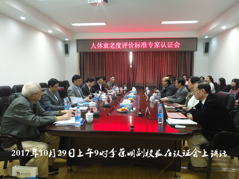 2017年10月29日我院在医学部召开了由“中国老年学和老年医学学会抗衰老分会”主办的“人体衰老度评价标准”专家认证会,认证专家有:何琪杨(北京协和医学院教授,中国老年学和老年医学学会抗衰老分会主任委员)、程晓曙(南昌大学教授和主任医师,第二附属医院院长,)、秦正红(苏州大学教授,药学院副院长,)、刘新光(广东医科大学教授,副校长)、田小利(北京大学教授、南昌大学生命科学院院长)、保志军(复旦大学教授和主任医师、附属华东医院副院长)、马雪松(江西省社会科学院二级研究员,省社会学学会副会长兼秘书长)、钟志兵(江西中医药大学教授和主任医师,心理健康教育中心主任)。8位专家针对黄河浪、吴磊教授提出的《生理-心理-社会三维人体衰老指标体系》等研究成果(国家自然科学基金项目部分,批准号81360446)进行了认证,与会所有专家对于该项成果都给予了高度认同。