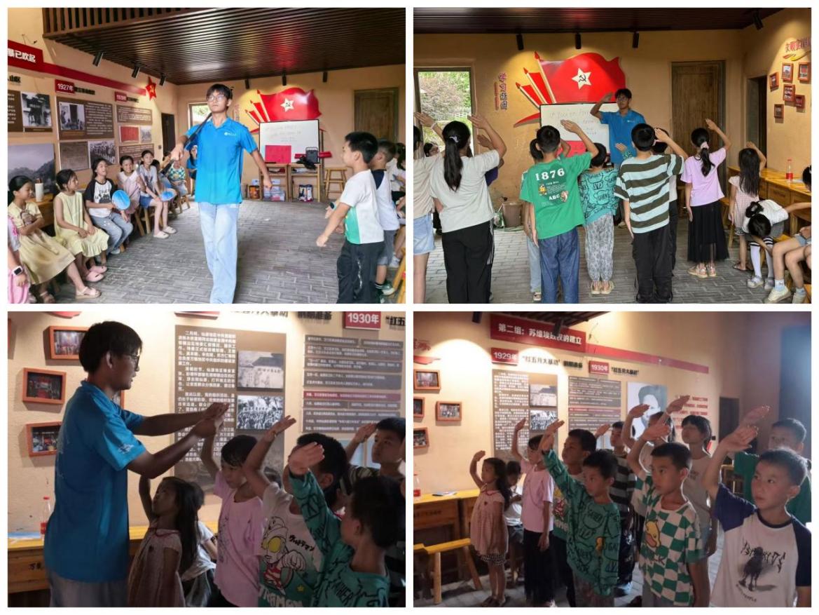 实践队开设国防知识小课堂,由南昌大学国旗护卫队成员示范标准敬礼姿势,耐心纠正动作细节,让孩子们感悟军礼的庄重。带领练习踢正步,传递纪律与团队精神。同时,用童趣语言讲解海陆空三军职能,线上图片展示军服,讲述保家卫国故事,在孩子们心中播撒爱国的种子。