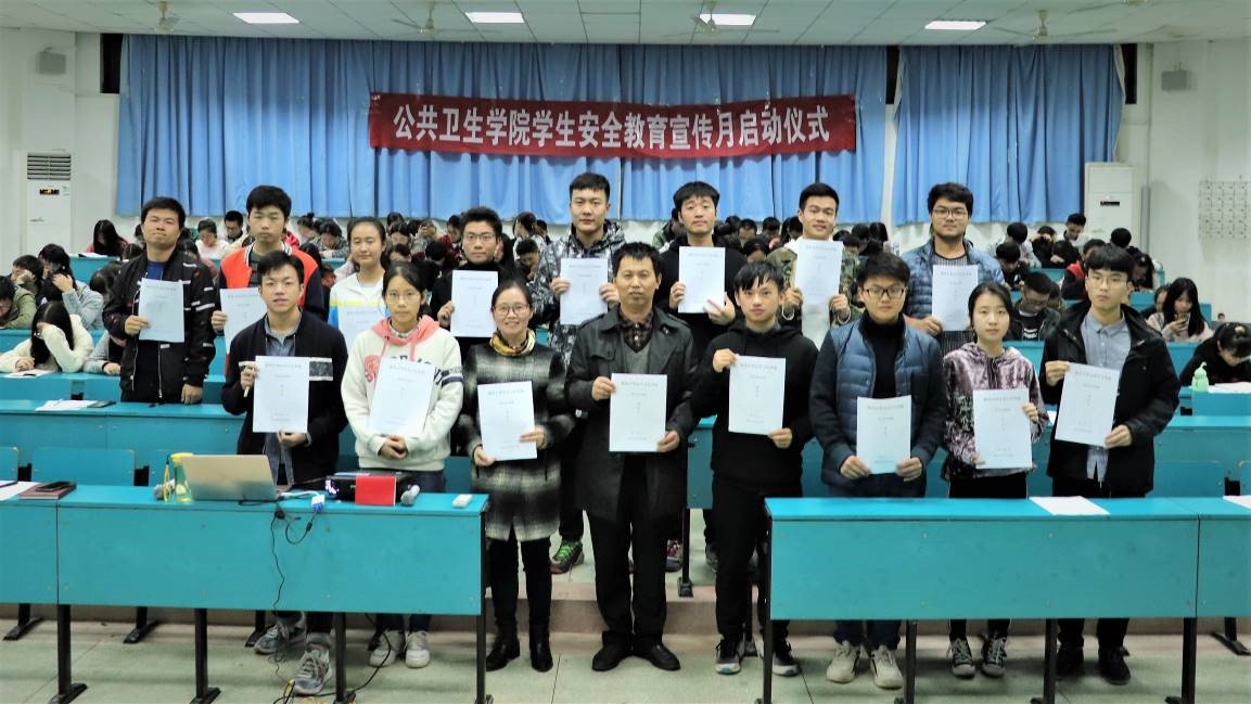 晚7点,启动仪式正式开始。活动由胡蓉老师主持进行,学工办主任刘爱兰老师首先发表讲话,她就仪式第一部分——“启动仪式及工作部署”给各班级开展安全教育活动与学生会相关部门的工作提出了具体建议与要求,她以近来学院出现的案例向在场人员提出“生活中无处不有安全隐患,做任何事时都应以‘生命至上,安全第一’为第一原则”,并以此部署了学院接下来的相关安全工作,如消防演习、校园网贷风险宣讲等,刘老师还表示安全工作应当常态化,每一位同学都不容忽视。随后进入第二部分“学生安全管理责任书”签字仪式,各班级班长代表班级进行签字并合影留念。仪式进行第三部分学生代表进行表态发言。院文明纠察队队长程亮同学以身作例向同学们讲解生活中应当如何注意消防、财产、食品及交通等安全问题,最后他自编的安全顺口溜“出校门,路边走,交通法规要遵守;过马路,仔细瞧,确认安全才通车行;红灯停,绿灯行,交通信号要看清……”也获得了同学们认可。最后,党总支副书记樊老师对此次启动仪式进行总结。他指出安全关系到每一位同学的健康成长,开展安全教育则是重中之重,并从以下几个方面开展工作:一是要认清形势,把安全牢记心中;二是明确责任,关注身边的安全问题;三是要完善措施,严格执行制度;四是开展形式多样、学生喜欢的校园安全教育活动。最后,樊书记衷心祝愿全体公共卫生学院的同学们在未来生活中平平安安、健康快乐地成长。至此,公共卫生学院“学生安全教育宣传月”启动仪式圆满结束。