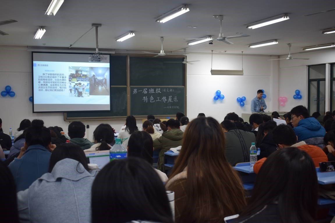 此次活动共有来自三个年级的11个班参加。班级(团支部)特色工作展示活动中,各班代表以PPT展示为主,在班级成长轨迹中穿插不少有趣的小故事、小视频,在不到8分钟的PPT里以各种方式向同学们展现了各班丰富多彩的班级重点工作及特色活动,收获了现场观众的阵阵掌声和喝彩。