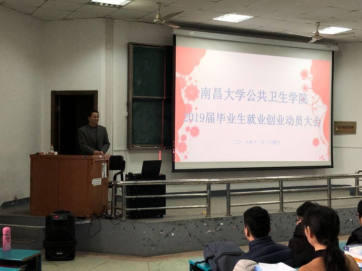 12月24日上午,公共卫生学院2019届毕业生就业创业动员大会在医学院第一教学大楼学术报告厅召开。学院党总支书记李友林出席会议并致辞,副院长周小军、副院长刘炎祁、党总支副书记樊国宝、学工办全体老师和学院2019届毕业生参加会议。...